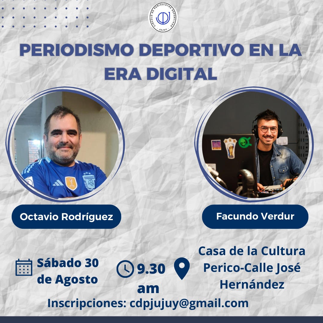 Organizado por el Círculo de Periodistas Deportivos de Jujuy, el próximo sábado 30 de agosto se llevará a cabo la capacitación denominada “Periodismo Deportivo en la Era Digital – Transmisiones Deportivas”.