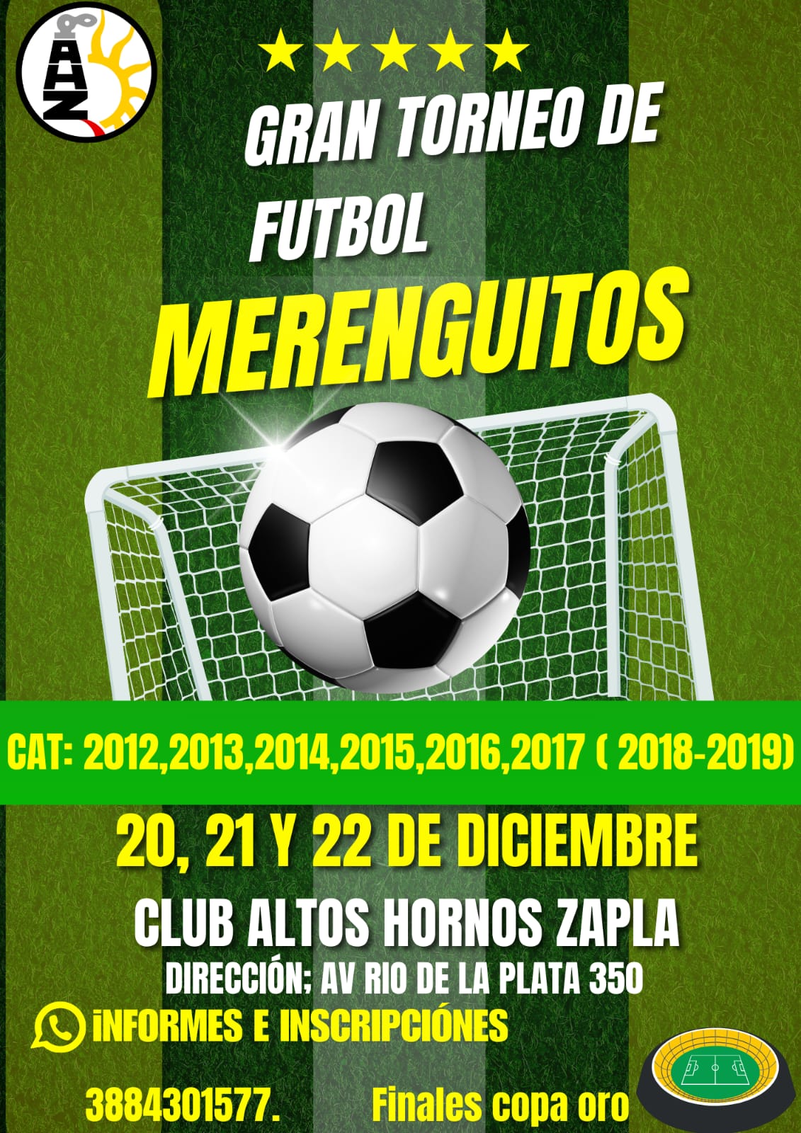 El Club Altos Hornos Zapla se prepara para vivir una nueva edición de su tradicional torneo de fútbol infantil, denominado «Merenguitos». Este año, el certamen se desarrollará del 20 al 22 de diciembre en las instalaciones del club, ubicadas en Avenida Río de la Plata 350 de la Ciudad de Palpalá.