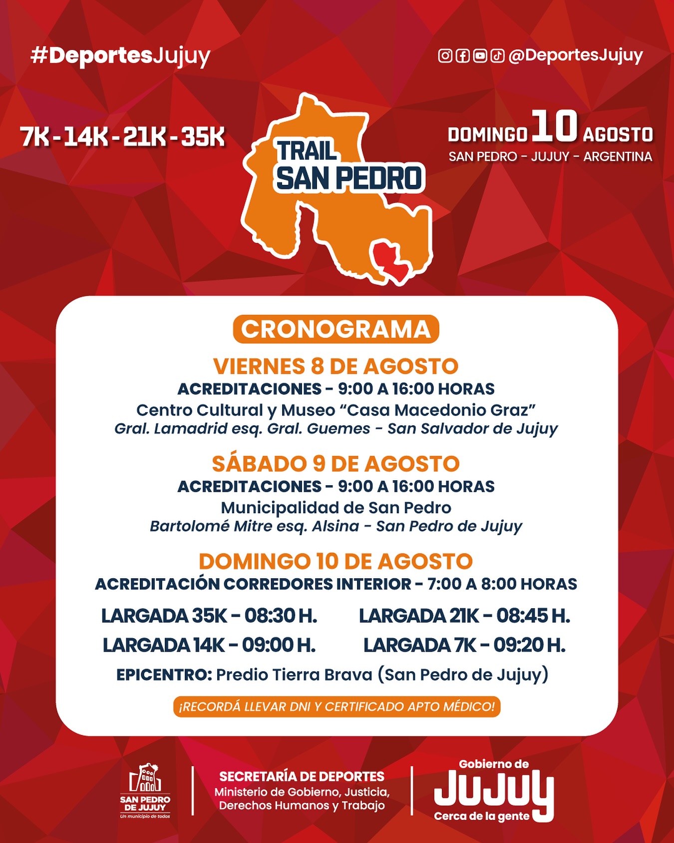 La organización estableció un cronograma de acreditaciones que comenzó el viernes 8 de agosto en el Centro Cultural y Museo Casa Macedonio Graz de San Salvador de Jujuy, y continuará el sábado 9 en la Municipalidad de San Pedro, en ambos casos de 9 a 16 horas. Además, el mismo domingo, de 7 a 8 horas, los corredores provenientes del interior tendrán un horario especial para retirar su kit. Es requisito obligatorio presentar el DNI y el certificado de apto médico para poder participar.